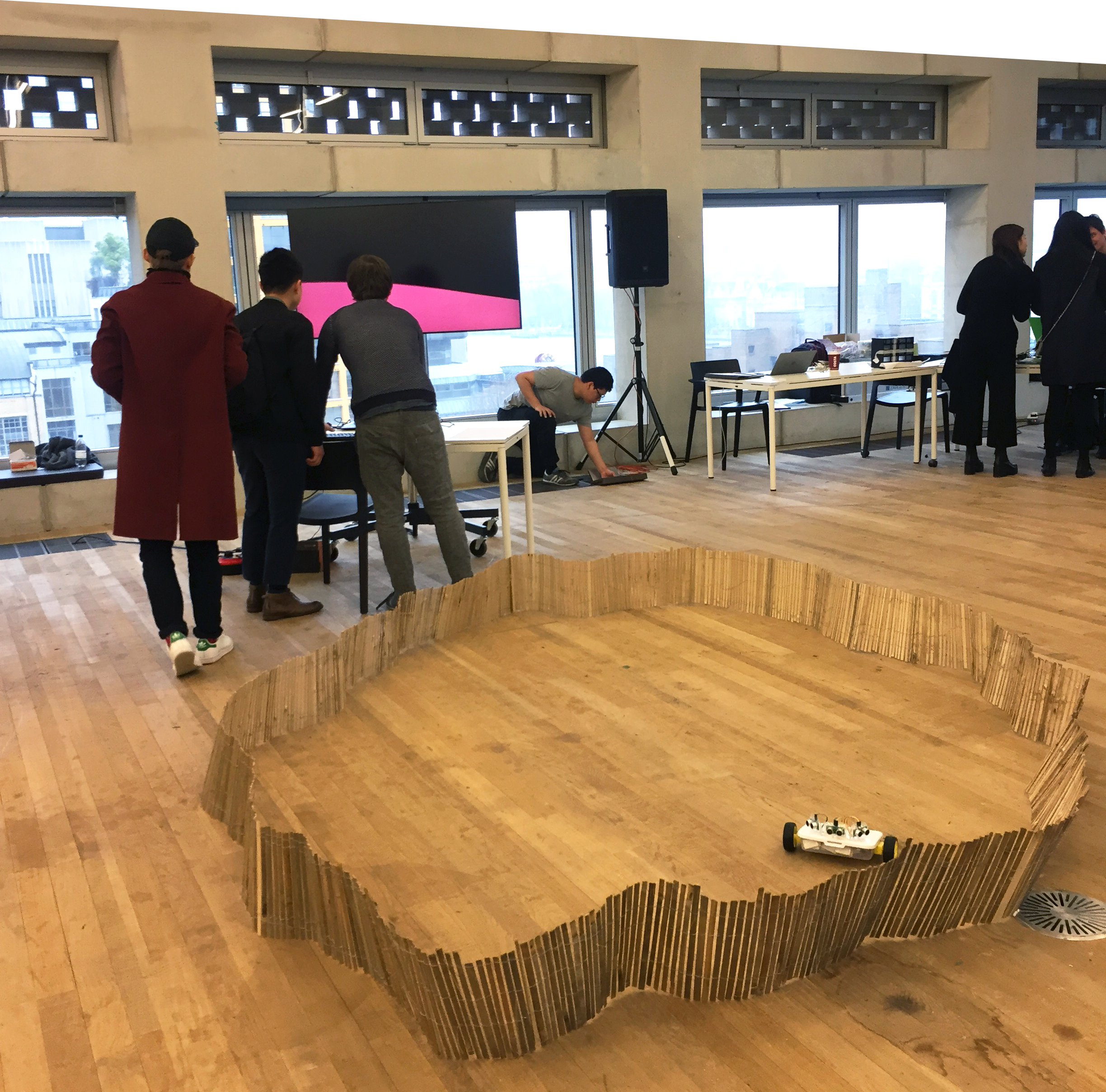We had a functioning prototype – the robot roamed the space, avoided obstacles and sent values to Aether. The virtual environment gathered the values from Aether to populate the virtual world.